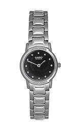 Quartz movement, Dress watch, Silver-tone hands and hour markers, Polished stainless steel bezel is set with small crystal accents, Polished stainless steel case, crown and caseback, Water resistant